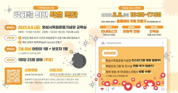 [금요저널] 화성특례시가 현충일을 맞아 화성시독립운동기념관에서 가족 단위 관람객을 위한 특별한 문화·체험프로그램 ‘평화를 위한 작은 폭탄’을 운영한다.