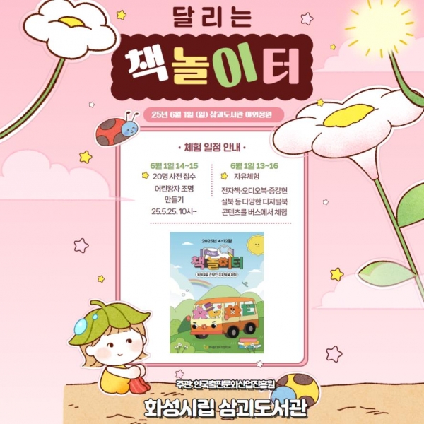 [금요저널] 화성시문화관광재단이 운영하는 화성시립삼괴도서관은 오는 6월 1일 오후 1시부터 4시까지 삼괴도서관 야외정원에서 2025년 ‘달리는 책 놀이터’ 프로그램을 운영한다.