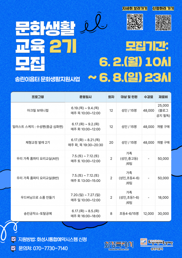 [금요저널] 화성시인재육성재단 송린이음터는 6월 2일부터 8일까지, 문화생활교육 2기 프로그램 수강생을 화성시통합예약시스템을 통해 선착순 모집한다고 밝혔다.