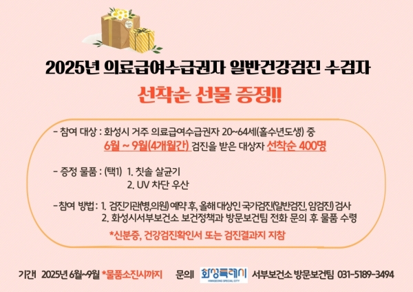 참여를 원하는 대상자는 기간 내 검진기관에 예약 후 검진을 받은 뒤, 화성시서부보건소 보건정책과 방문보건팀에 전화로 문의하면 선물을 받을 수 있다.