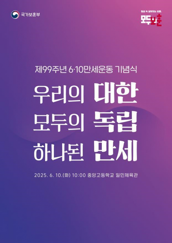 [금요저널] 국가보훈부는 일제강점기 6·10만세운동 선열들의 숭고한 독립 의지와 애국정신을 계승하기 위한 ‘제99주년 6·10만세운동 기념식’을 10일 오전, 중앙고등학교 체육관에서 거행한다고 밝혔다.
