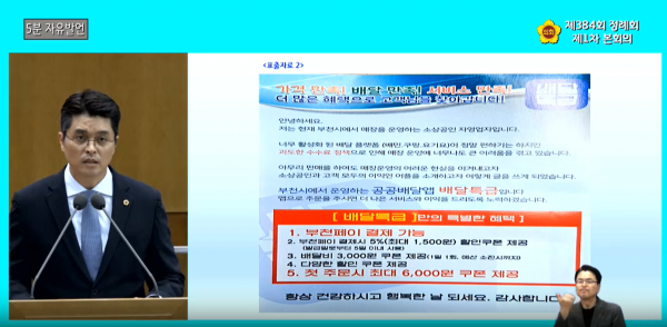 이재영 의원은 “부천의 한 소상공인이 생존을 위해 직접 사비를 들여 경기도 공공배달앱 '배달특급'의 이용을 호소하는 전단지를 제작해 홍보하는 안타까운 사연을 소개하며 발언을 시작했다.