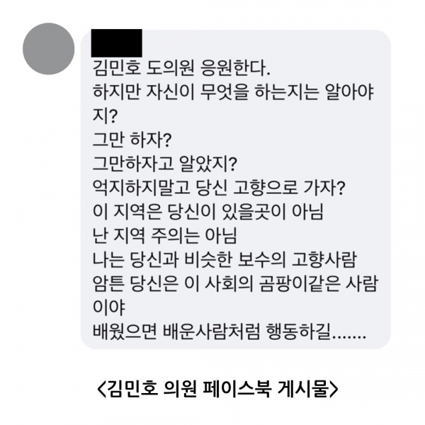 김민호 의원은 “이러한 발언은 정치적 견해 차이를 넘어선 혐오와 배제의 언어이며 건전한 민주주의를 해치는 폭력과도 같다”고 설명했다.