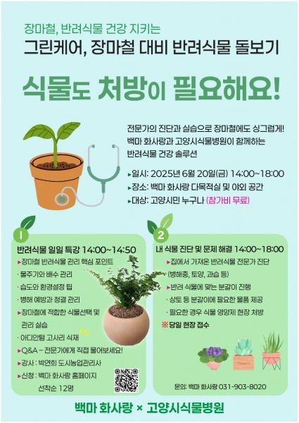 [금요저널] 고양특례시는 반려식물 돌봄을 배우고 직접 전문가의 진단까지 받을 수 있는 실속 있는 체험 행사인 ‘그린케어, 장마철 대비 반려식물 돌보기’를 오는 20일 오후 2시부터 6시까지 백마 화사랑 다목적실과 야외 공간에서 개최한다고 밝혔다.
