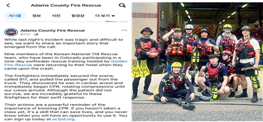 미국 소방당국의 콜로라도주 아담스 카운티 소방서는 공식 SNS 계정을 통해 “한국 구조대원들의 구조 행동은 모든 소방관이 따라야 할 교과서 같은 대응이었다”며 “즉각적인 CPR과 현장 통제로 신속한 구조 활동을 할 수 있었다”고 전하며 사진과 함께 감사를 전했다.