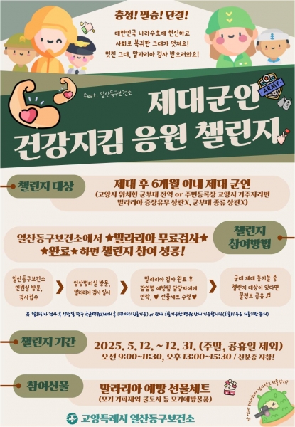 보건소 관계자는 “이번 지원이 누구보다 안전하고 건강하게 생활해야 하는 군장병들에게 작게나마 도움이 되길 바란다”며 “보건소에서는 제대 후 6개월 이내 제대군인을 대상으로 ‘제대군인 건강지킴 응원챌린지’를 진행하고 있으니 제대를 앞둔 군장병들의 많은 참여를 부탁드린다”고 당부했다.