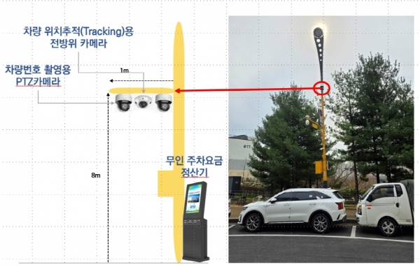 ‘스마트 노상주차장 주차관리시스템’은 인공지능과 영상 분석 기술을 접목한 주차관리시스템으로 차량의 입출차 및 주차면의 상태를 실시간으로 분석하고 3디 영상 분석 시스템을 적용해 신속하고 정확한 주차 요금 부과가 가능하다.