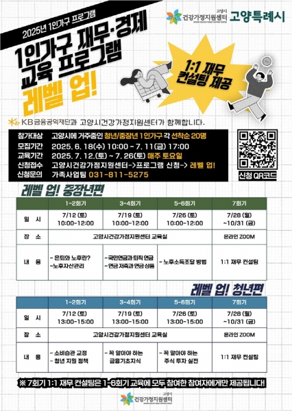 [금요저널] 고양시건강가정지원센터는 KB금융공익재단과 함께하는 1인가구를 위한 맞춤형 재무·경재 교육 ‘레벨 업’ 프로그램에 참여할 참여자를 모집한다.