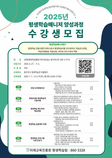 [금요저널] 동두천시 미래교육진흥원은 오는 6월 27일부터 7월 4일까지 ‘2025년 평생학습 매니저 양성과정’ 수강생을 모집한다고 밝혔다.