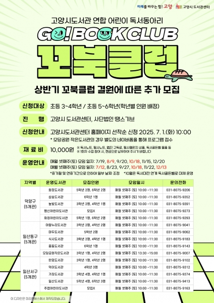 고양시도서관센터 관계자는 “꼬북클럽은 단순한 독서 활동을 넘어, 어린이들의 감정 표현, 사회적 상상력 및 공동체 의식을 키울 수 있는 프로그램”이라며 “독서를 좋아하거나 책을 통해 친구를 만나고 싶은 어린이들이 많이 참여하길 기대한다”고 전했다.