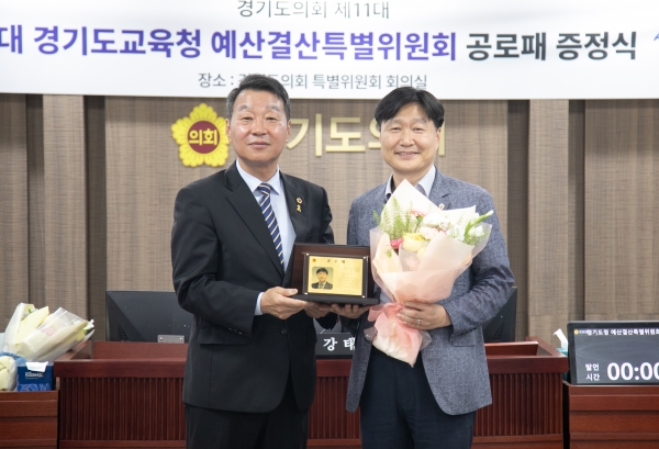 [금요저널] 경기도의회 도시환경위원회 김태희 의원이 26일 경기도의회에서 열린 ‘제11대 경기도교육청 예산결산특별위원회 공로 수여식’에서 공로패를 수상했다.