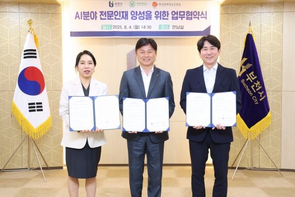 [금요저널] 부천시는 지난 4일 부천시청 만남실에서 유한대학교, 한국만화영상진흥원과 함께 ‘인공지능 분야 첨단산업 인재 양성을 위한 만화·영상 부트캠프 운영’ 업무협약을 체결했다고 5일 밝혔다.