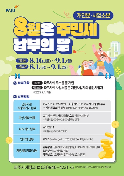파주시 관계자는 “주민세는 파주시민에게 영향을 미치는 다양한 행정서비스의 재원이 되는 세목으로 시민들의 성실한 납부가 행정업무 제공에 큰 도움이 된다”며 “납기 마지막 날에는 자동응답시스템이나 금융 앱 등 전산 접속량이 많아 시간이 많이 소요될 수 있으니, 가급적 납기 말 이전에 납부해 불이익이 발생하지 않도록 하기 바란다”고 당부했다.