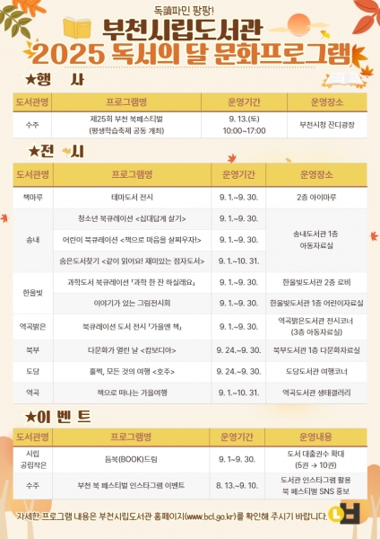 특히 9월 13일 부천시청 잔디광장에서 열리는 ‘제25회 부천 북 페스티벌’은 ‘독파민 팡팡 놀러나온 도서관’을 주제로 시민 누구나 즐길 수 있는 부천 대표 책 축제로 진행된다.
