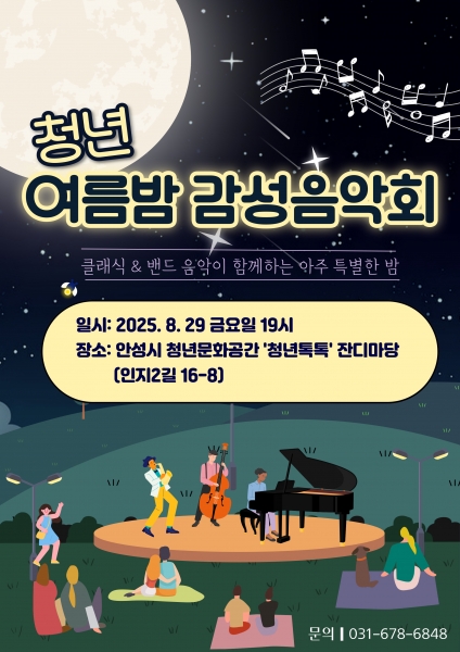 김보라 안성시장은 “도심 속 잔디마당에서 열리는 이번 감성음악회가 청년과 시민 모두에게 특별한 추억을 선사하길 바란다”며 “앞으로도 청년문화공간 ‘청년톡톡’을 거점으로 한 다양한 야간문화 프로그램을 지속적으로 추진하겠다”고 말했다.