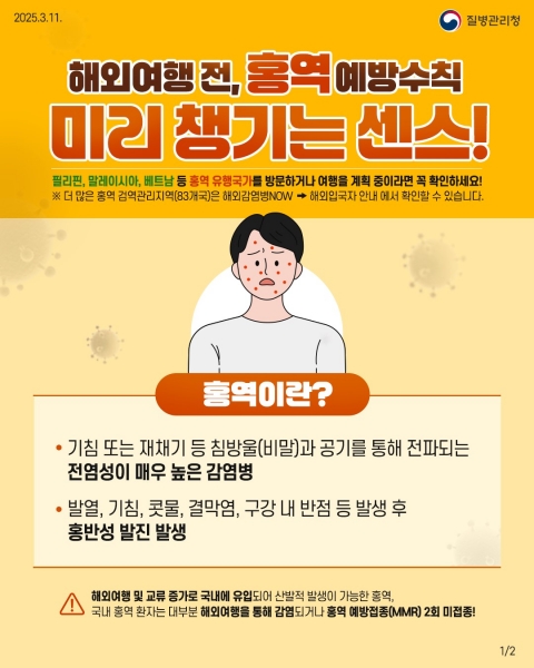 현재 동남아시아를 중심으로 홍역이 계속 유행하고 있어 해외 체류 중 감염 위험이 큰 상황이다.