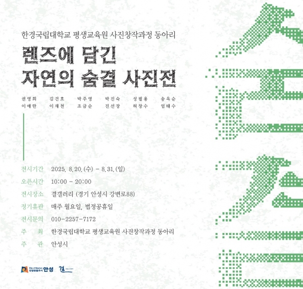 [금요저널] 한경국립대학교 평생교육원 사진창작과정 동아리 회원들이 오는 8월 20일부터 8월 31일까지 안성천 작은미술관 결갤러리에서 ‘렌즈에 담긴 자연의 숨결’ 이라는 주제로 단체전을 개최한다.