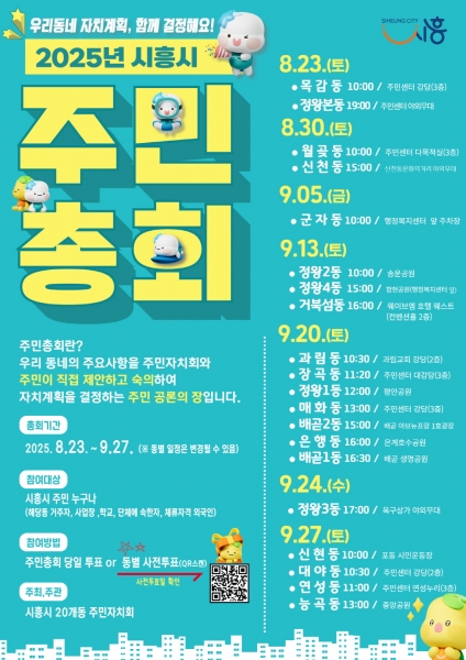각 동 주민총회 일정은 △8월 23일 목감동, 정왕본동 △8월 30일 신천동, 월곶동 △9월 5일 군자동 △9월 13일 정왕2동, 정왕4동, 거북섬동 △9월 20일 은행동, 매화동, 정왕1동, 배곧1동, 배곧2동, 과림동, 장곡동 △9월 24일 정왕3동 △9월 27일 대야동, 신현동, 능곡동, 연성동 순으로 진행된다.