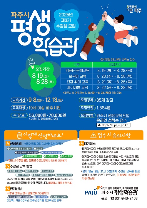 [금요저널] 파주시 평생학습관은 8월 19일부터 8월 28일까지 2025년 제3기 수강생 모집을 진행 중이다.