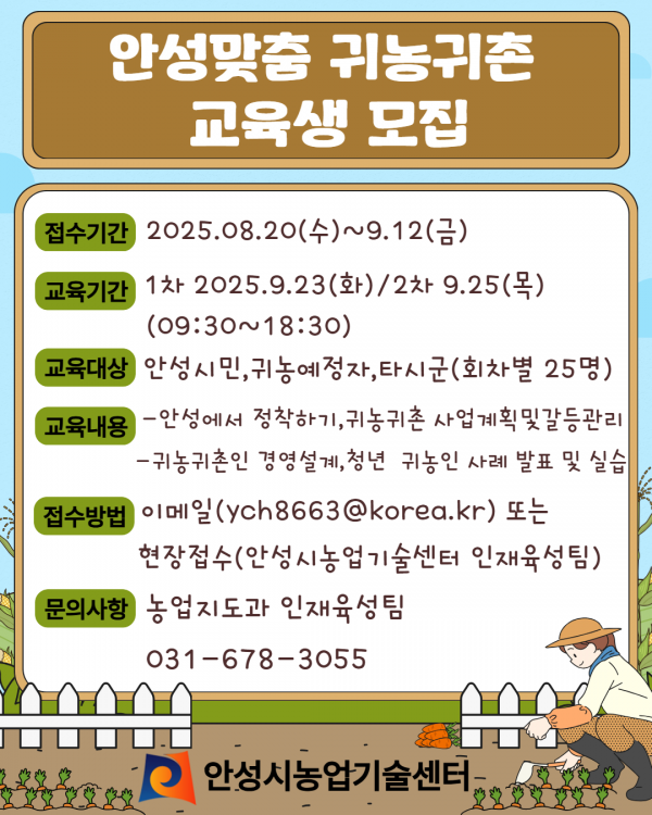교육 접수 방법은 안성시농업기술센터 농업지도과 인재육성팀 방문접수 또는 메일접수로 가능하며 안성 시민, 귀농예정자 누구나 접수가 가능하다.