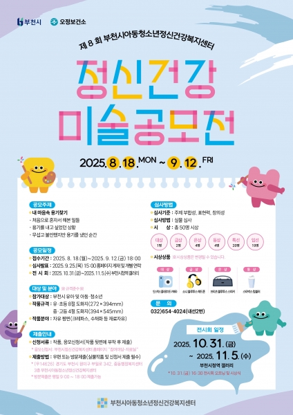 김은옥 부천시보건소장은 “이번 미술공모전을 통해 아이들이 자신의 감정을 솔직하게 표현하고 내면의 용기를 발견하는 소중한 경험이 되기를 바란다”며 “앞으로도 아이들이 건강한 정서와 긍정적인 자아를 형성할 수 있도록 다양한 정신건강 프로그램을 지속적으로 마련하겠다”고 말했다.