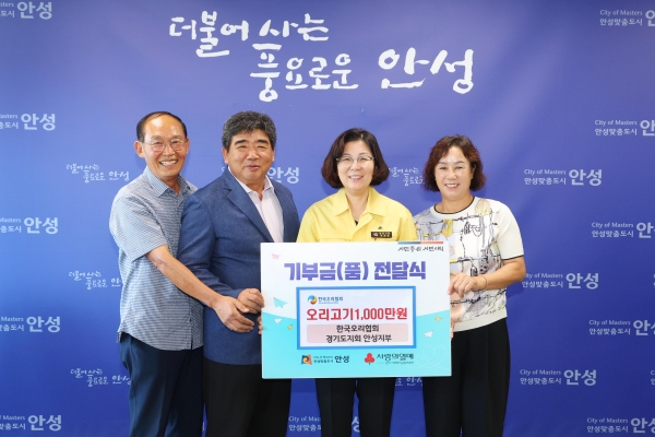 이번 기부는 한국오리협회 안성지부의 첫 기부활동으로 지역사회 내 기업 및 단체들의 따뜻한 나눔 문화 확산에도 긍정적인 영향을 미칠 것으로 기대된다.