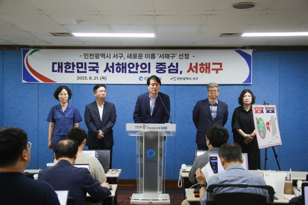 [금요저널] 인천 서구는 21일 목요일 인천시청 브리핑룸에서 기자회견을 열고 행정체제 개편에 따라 검단구와 분리되는 서구의 새로운 명칭으로 ‘서해구’를 최종 선정했다고 공식 발표했다.
