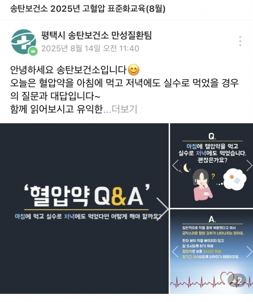 이번 달은 고혈압 표준화 교육이 비대면 방식으로 활발히 운영되고 있으며 특히 직장인이나 보건소 방문이 어려운 시민들에게 시간·공간적 제약 없이 편리하게 참여할 수 있다는 점에서 큰 호응을 얻고 있다.