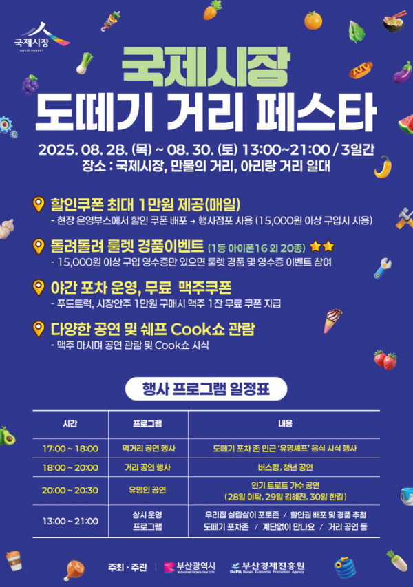 김봉철 시 디지털경제실장은 “국제시장은 오랜 세월 부산의 대표 상권이자 역사와 추억이 담긴 공간”이라며 “이번 행사를 통해 시장 상인들의 매출 증대와 소비를 촉진하고 시민과 관광객에게 다양한 볼거리와 즐길 거리를 제공하겠다”고 전했다.