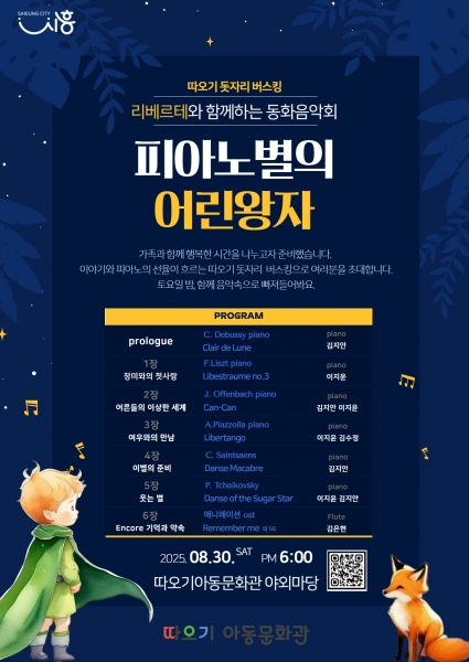 세계적으로 사랑받는 동화 어린왕자 이야기를 모티브로 한 클래식 피아노 연주와 동화가 결합된 동화음악회로 진행된다.