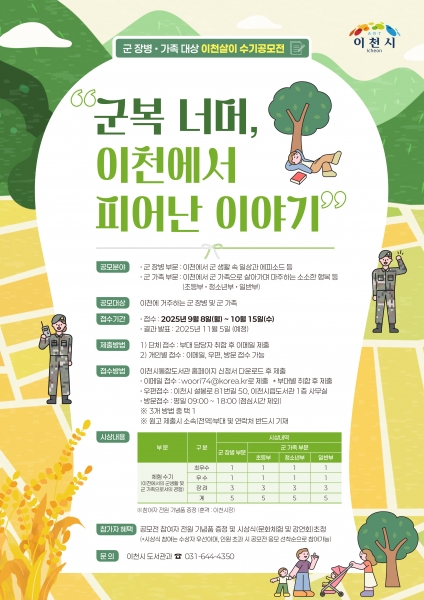 [금요저널] 이천시 도서관은 군 장병과 그 가족을 대상으로 ‘군복 너머 이천에서 피어난 이야기’라는 주제로 이천살이 수기 공모전을 개최한다.