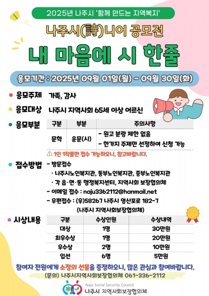 [금요저널] 전라남도 나주시지역사회보장협의체 노인 실무분과는 관내 만 65세 이상 어르신을 대상으로 ‘2025년 나주시니어 제1회 내 마음에 시 한 줄 공모전’을 오는 9월 1일부터 9월 30일까지 개최한다.