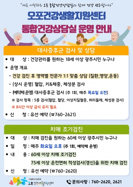 오포건강생활지원센터 관계자는 “대사증후군은 심뇌혈관질환으로 경도인지장애는 치매로 이어질 수 있는 만큼 조기 진단과 관리가 중요하다”며 “검진부터 상담, 예방까지 한 번에 제공하는 맞춤형 건강서비스를 통해 시민 건강 수준 향상에 기여할 수 있도록 최선을 다하겠다”고 말했다.