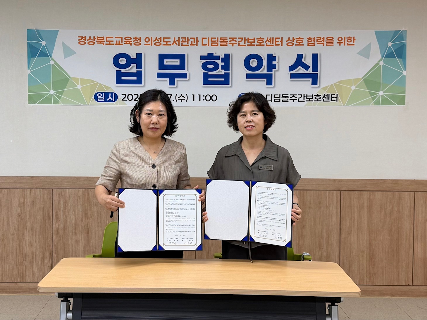 □ 경상북도교육청 의성도서관(관장 이미경)은 8월 27일(수) 오전 11시, 디딤돌주간보호센터(센터장 강영희)에서 지역 독서문화 활성화를 위한 업무협약을 체결했다.