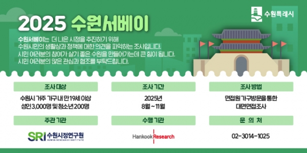 이번 조사는 수원시정연구원이 주관하고 여론조사 전문기관인 한국리서치가 수행한다.