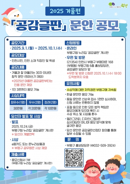 [금요저널] 부평구가 9월 1일부터 10월 1일까지 한 달간 ‘2025년 겨울편 공감글판’ 문안을 공모한다.