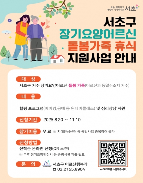 전성수 서초구청장은 “돌봄 스트레스로 지친 가족들의 일상 회복과 치유를 위한 의미있는 시간이 되길 바란다”며 “앞으로도 돌봄 부담을 덜어드릴 수 있는 실질적인 지원을 지속적으로 추진해 나가겠다”고 전했다.