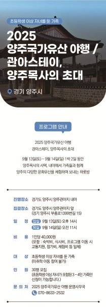 [금요저널] 양주시가 ‘2025 양주국가유산 야행’ 주제 가운데 하나인 ‘야숙’ 프로그램에 대한 참가자를 모집한다고 29일 밝혔다.