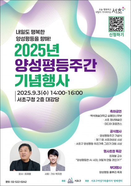 [금요저널] 서울 서초구는 양성평등주간을 맞아 오는 9월 3일 오후 2시, 구청 2층 대강당에서 ‘2025년 서초구 양성평등주간 기념행사’를 개최한다고 밝혔다.