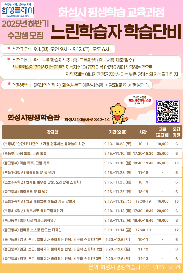 [금요저널] 화성특례시는 오는 9월 1일부터 12일까지 ‘2025년 하반기 느린학습자 학습단비’ 프로그램의 수강생을 선착순 모집한다고 밝혔다.