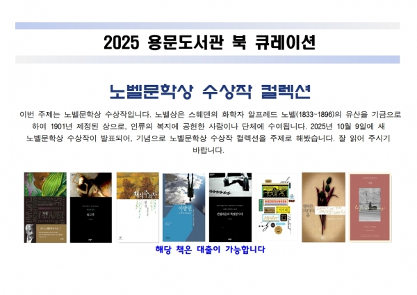 이번 책 추천 서비스은 인류의 보편적 가치와 삶의 깊이를 탐구해 온 노벨문학상 수상작을 통해 군민들에게 세계 문학의 다양성을 소개하고 독서문화 저변 확대를 도모하기 위해 기획됐다.