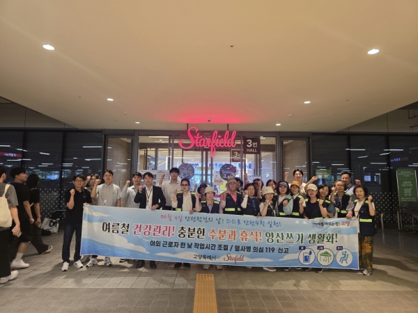 이번 캠페인은 고양시와 안전보안관, 스타필드 고양 직원 등 30여명이 함께 참여한 가운데, 폭염으로 인한 시민 건강 피해를 최소화하고 예방 수칙을 홍보하기 위해 마련됐다.