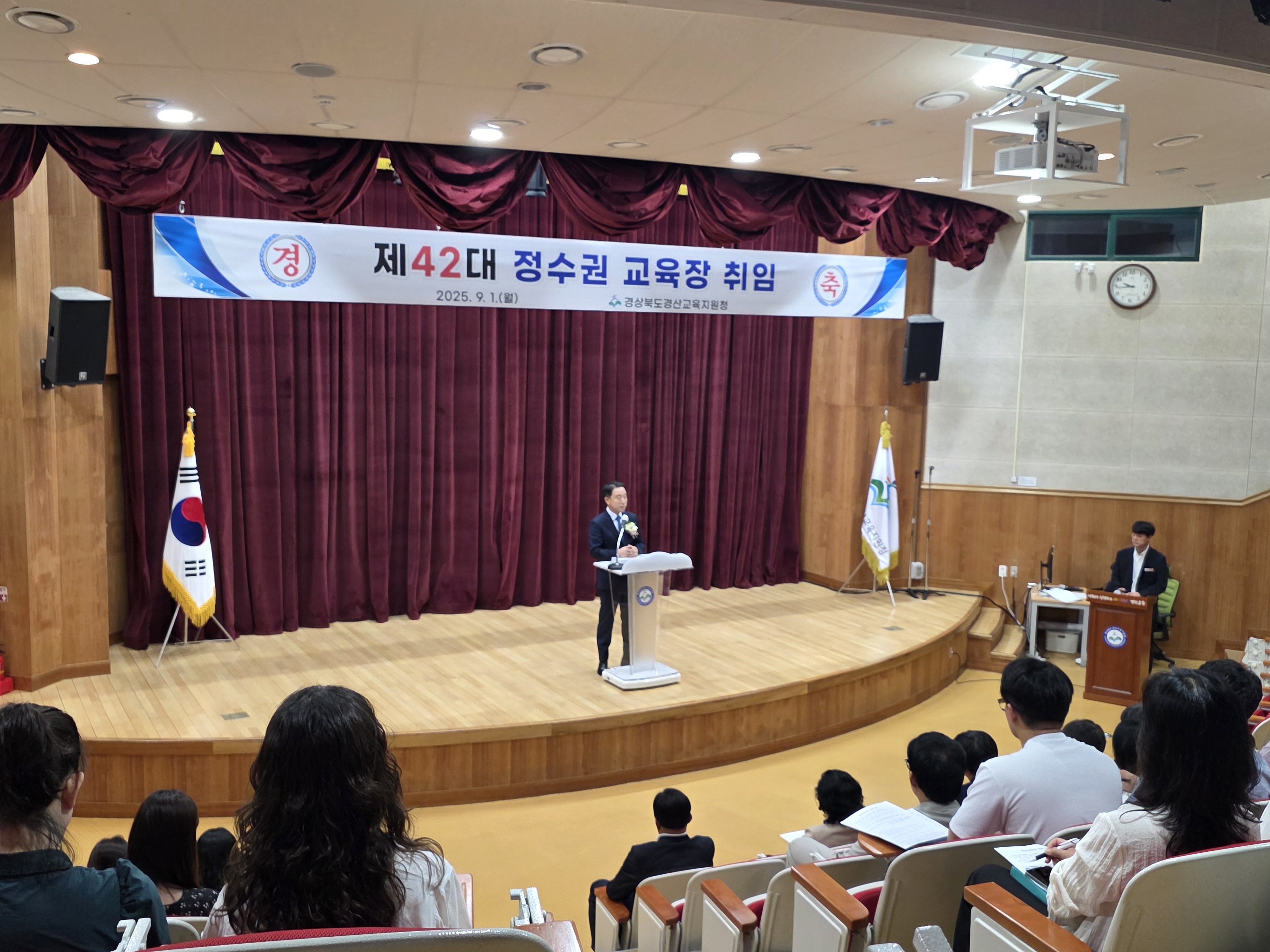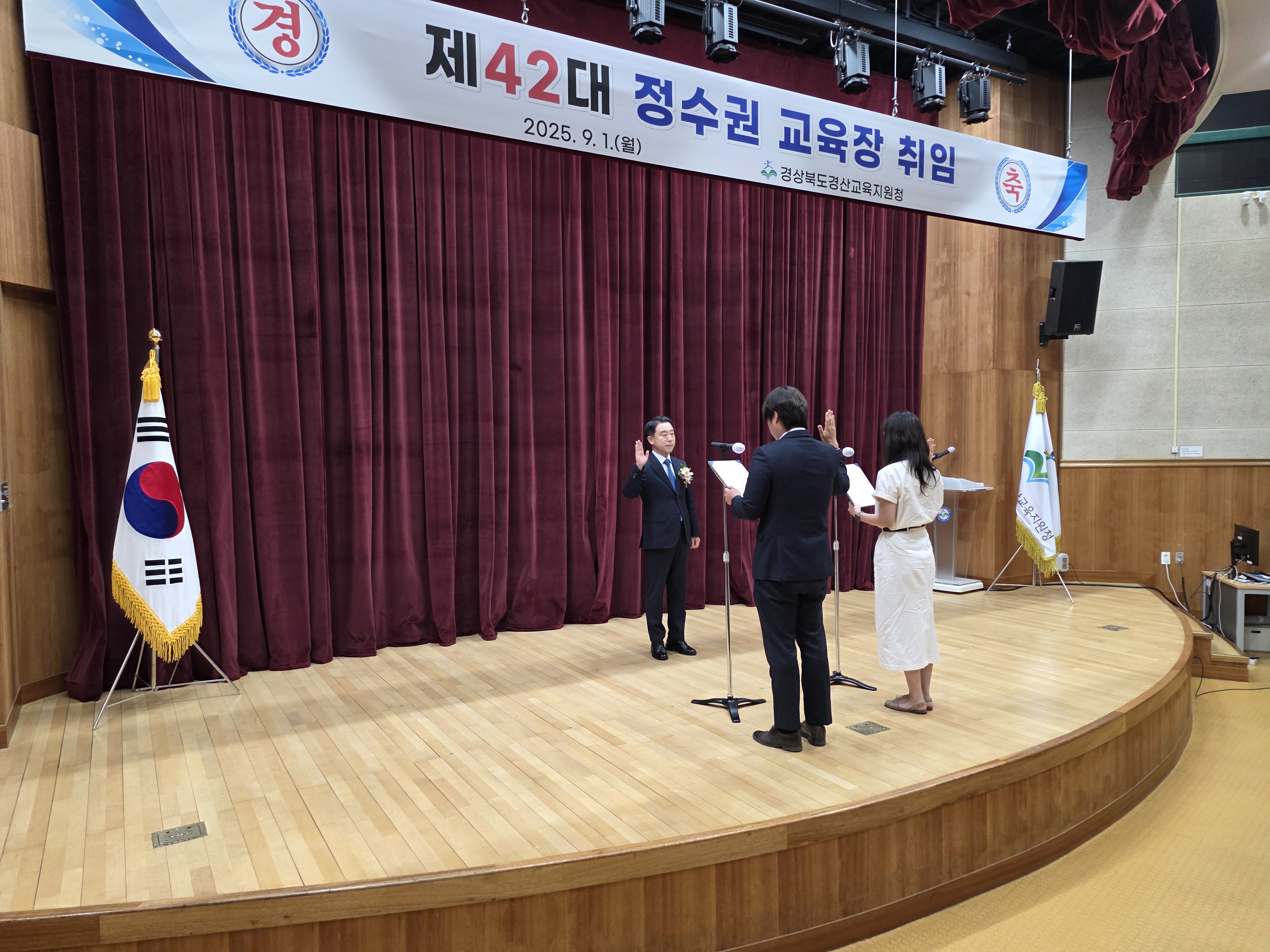□ 경상북도경산교육지원청은 9월 1일 오전 9시 30분 교육지원청 본관 1강당에서 제42대 정수권 경산교육지원청 교육장 취임식을 열고, 교육장으로서의 첫 업무의 시작을 알렸다.