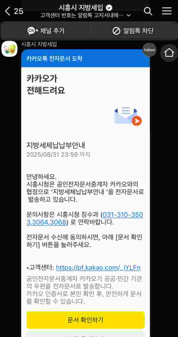알림톡을 수신한 납세자는 본인 인증 절차를 거쳐 안전하게 문서를 열람할 수 있으며 카카오페이 등 연계된 납부 수단을 활용해 편리하게 세금을 납부할 수 있다.