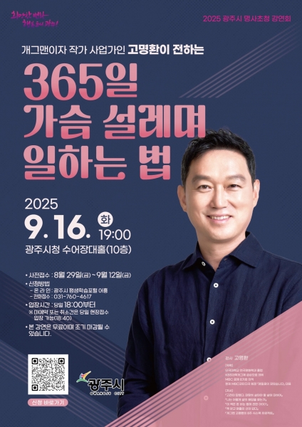 이번 강연에는 20년 이상의 방송 경력을 쌓고 현재는 작가로 활동 중인 고명환 강사가 초청돼 ‘365일 가슴 설레며 일하는 법’을 주제로 시민들과 만난다.