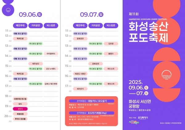 아울러 정명근 시장은 “서해의 바람, 황토 토양, 그리고 큰 일교차가 키워낸 송산포도는 이미 전국적으로 품질을 인정받고 있다”며 “풍요로운 가을, 송산포도를 마음껏 즐기고 가족과 이웃이 함께 웃고 어울리며 달콤한 추억을 만드는 축제가 되길 기대한다”고 덧붙였다.