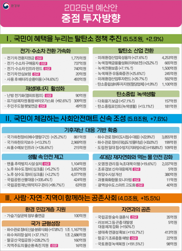 2026년도 환경부 예산안 15조 9,160억원… 예산 및 기금안 총지출 올해 대비 7.5% 늘려 편성