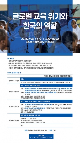 이에 국회 글로벌 지속가능발전 · 인도주의 포럼은 GPE 와 함께 국제 교육 원조에서 한국의 역할을 모색하는 자리를 마련했다.