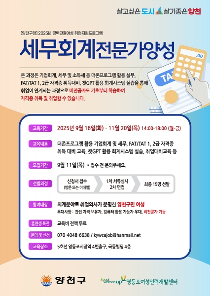 [금요저널] 양천구는 경력단절여성의 실질적인 재취업을 지원하기 위해 실무 중심의 ‘세무회계 전문가 양성과정’을 개설하고 오는 11일까지 수강생을 모집한다고 밝혔다.