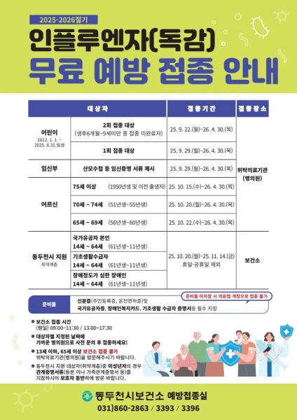 [금요저널] 동두천시는 오는 9월 22일부터 내년 4월 30일까지 인플루엔자 국가예방접종을 순차적으로 실시한다고 밝혔다.